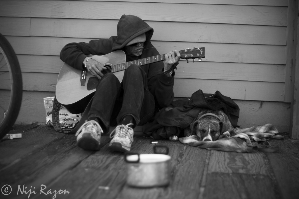 - Gary Carter with his dog Hina plays his guitar for some change at the Ventura pier in Ventura, Calif., on Friday, May 17, 2013. Gary says he acquired his dog from someone "off the ghettos of Oxnard"; he named her Hina, which means goddess in Hawaiian. He has been taking care of Hina ever since, playing guitar and even doing impressions. Gary says his best impression is of cowboy Slim Pickens. (© Niji Razon 2013)