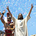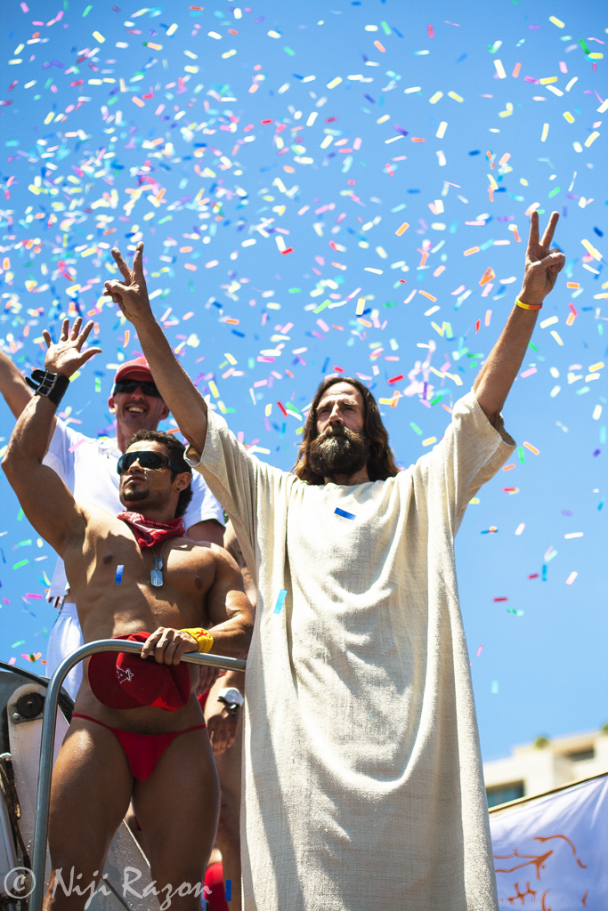 - Despite what protesters might say about the relationship between homosexual people and the Christian faith, this particular Jesus showed otherwise. Erik Des, portraying Jesus, signals his presence aboard a fire truck as they pass anti-gay protesters in the gay parade of the LA Pride event in West Hollywood in Los Angeles, Calif., on Sunday, June 9, 2013. He would then throw a more crude gesture involving his middle fingers seconds later. (© Niji Razon 2013)